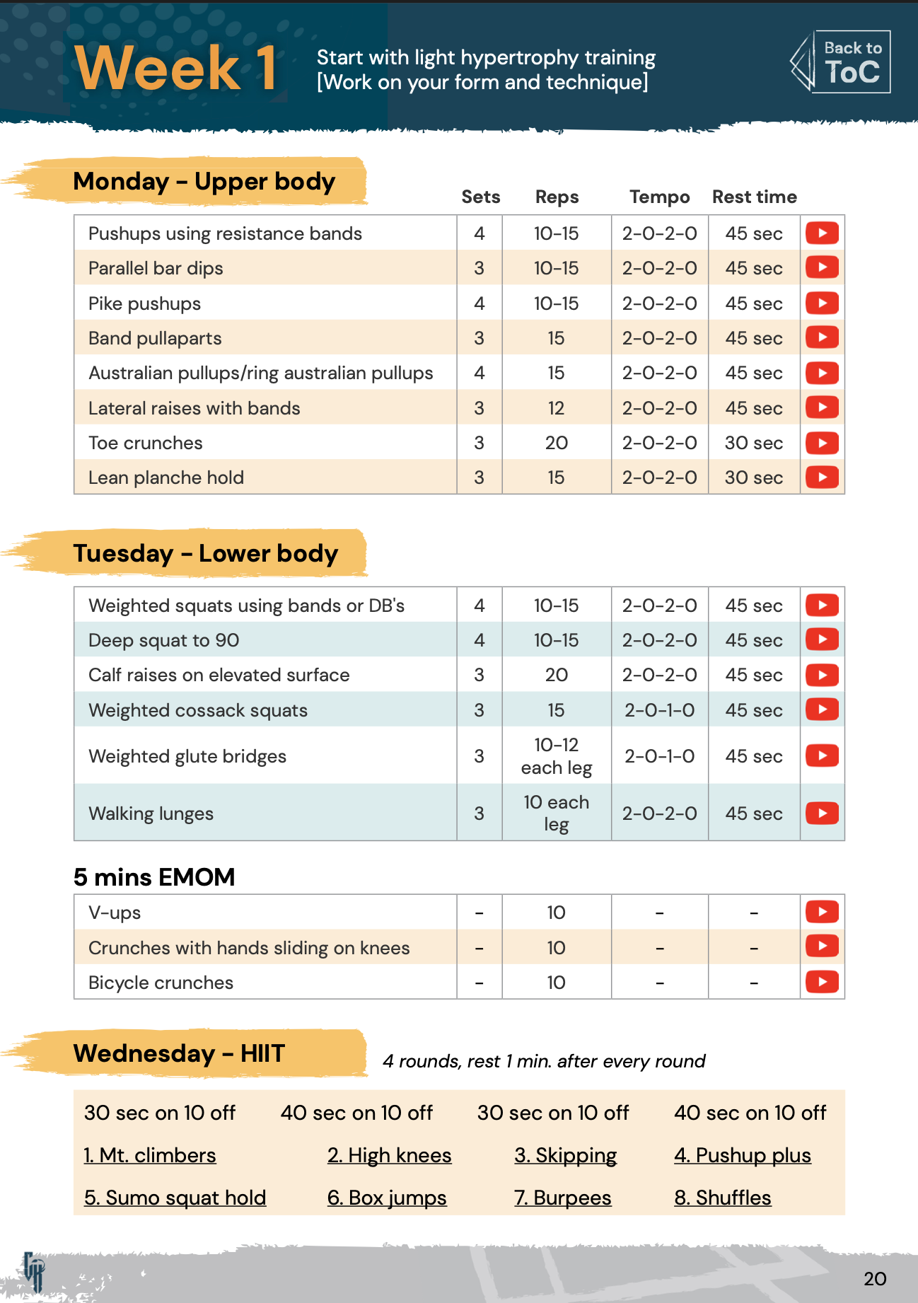 The PDF includes a clear 8-week, week-by-week progression with built-in balance between intensity, recovery, and performance, plus direct video demo links for every exercise.